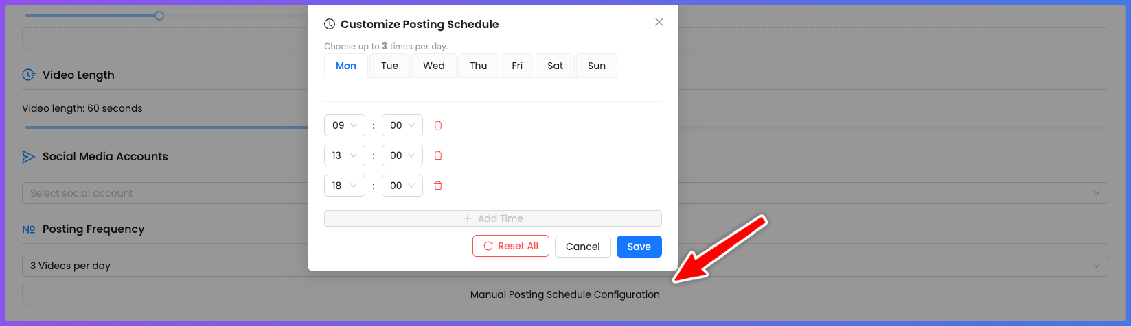 Open the βPosting Scheduleβ modal via the button in posting frequency section