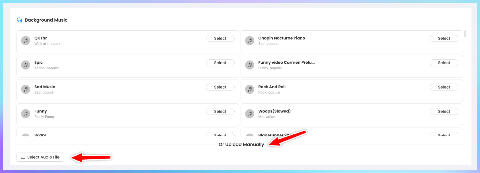 Added an βUpload Custom Audio Fileβ option under the Background Music section.
