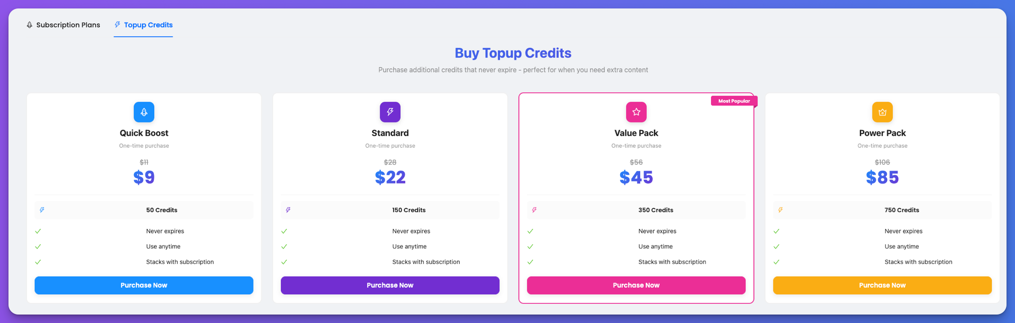 Weβve just launched the Top-Up Credits feature so you never run out of credits while creating videos! Now you can purchase additional credits directly from your dashboard whenever you need more β without waiting for your monthly subscription renewal.